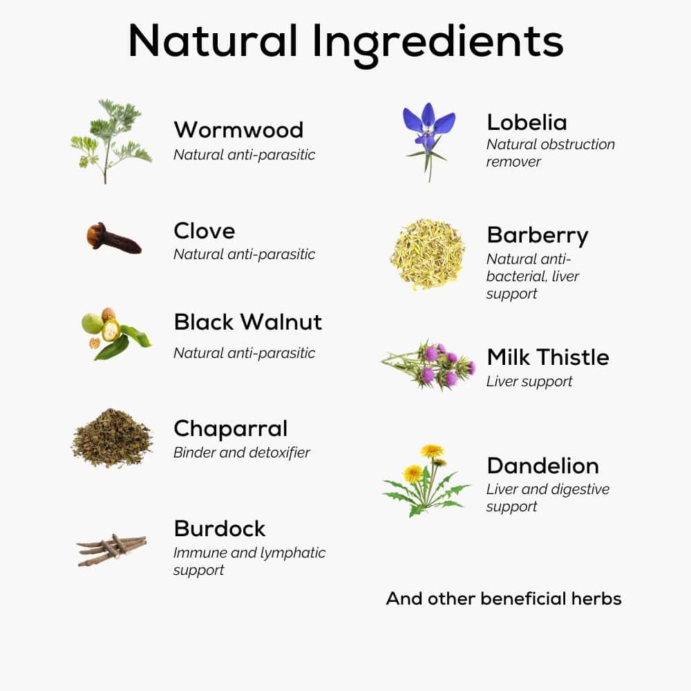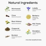 HMCTN: Chaparral leaf, Wormwood herb, Black Walnut hull, Cloves, Burdock root, Lobelia herb, Barberry root.